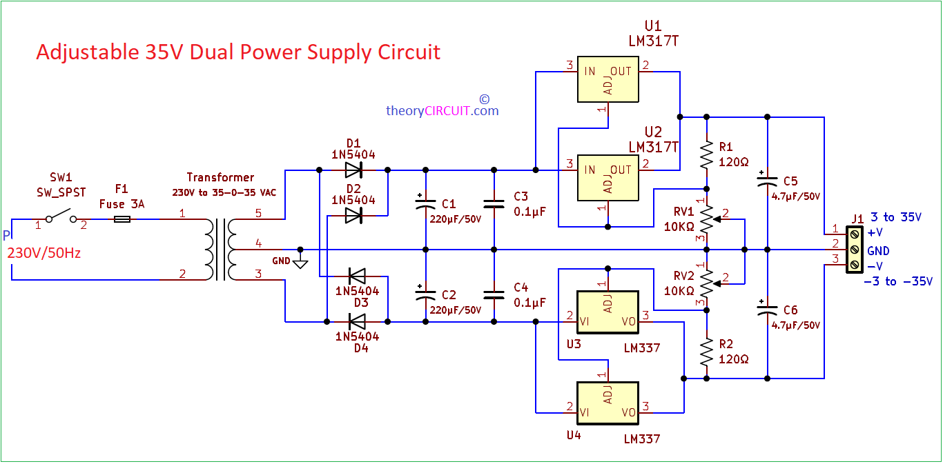 Adjustable 35V Dual Power Supply Circuit